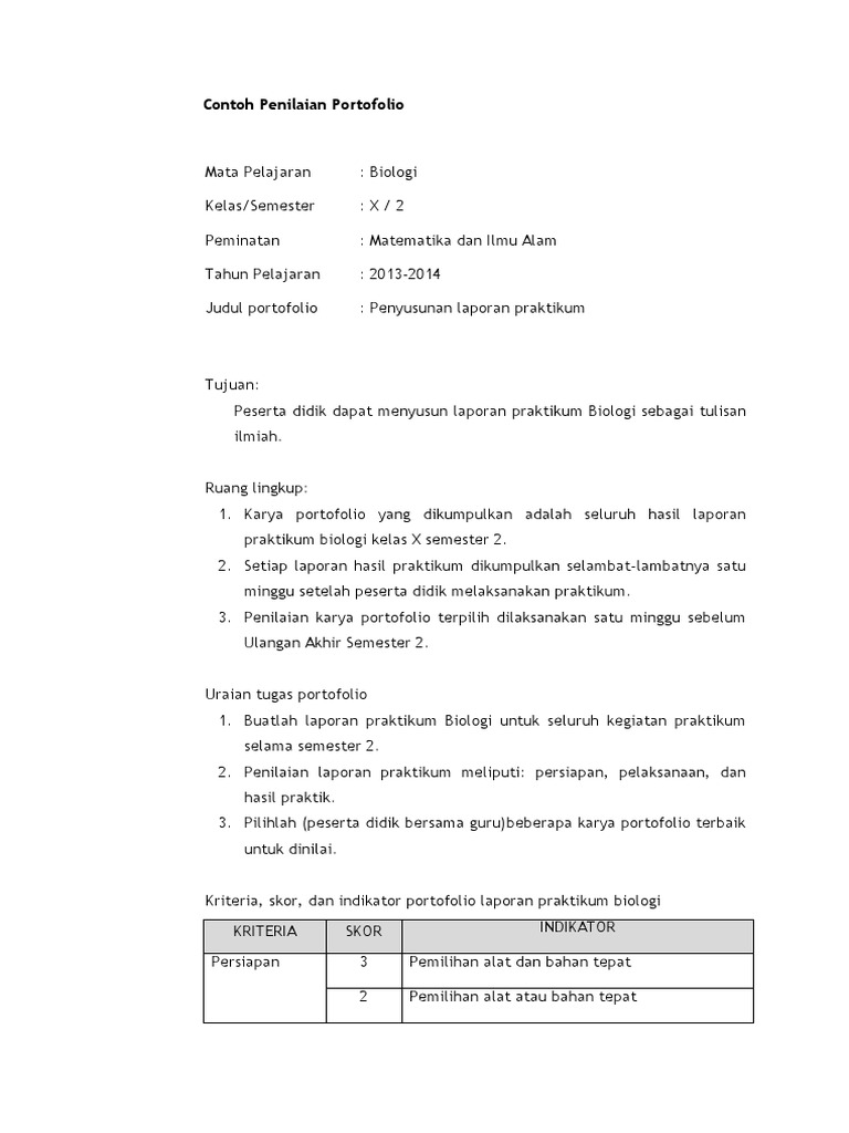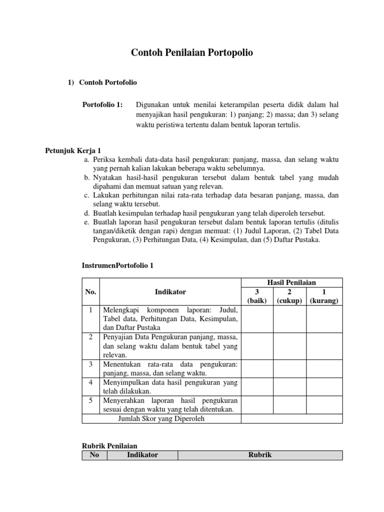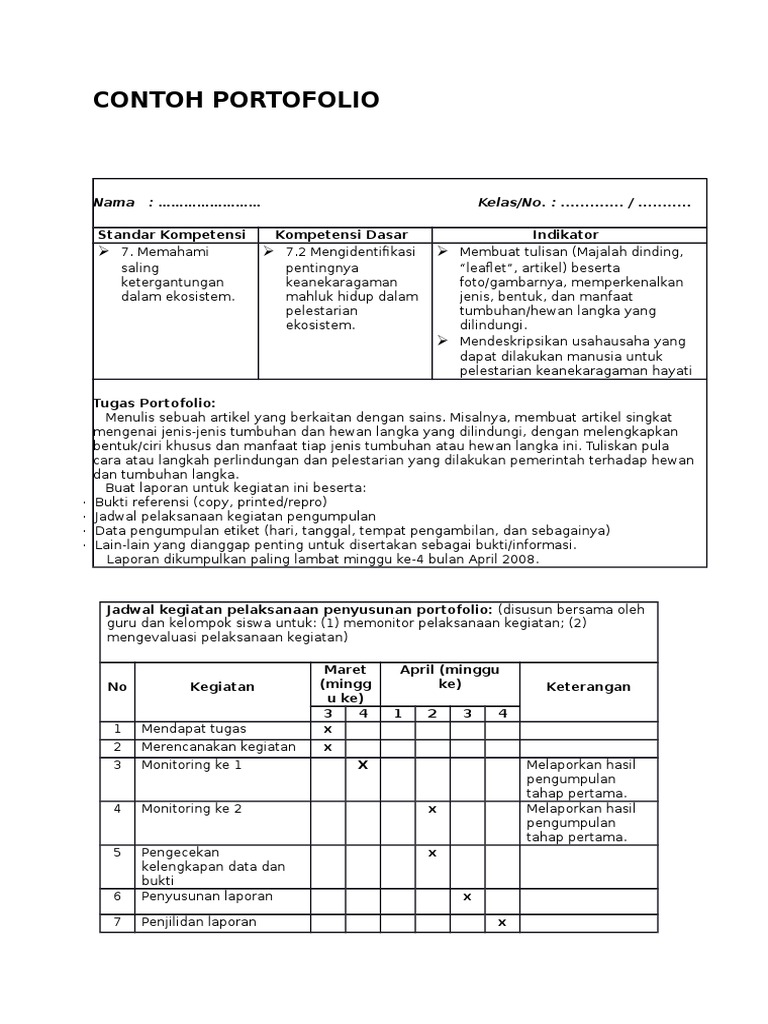 0 menganggap dokumen ini tidak bermanfaat Tandai dokumen ini sebagai tidak bermanfaat. Contoh Tugas Portofolio dan Penilaiannya Mata Pelajaran IPA SMP kelas VII semester II satu tugas Author. Portofolio adalah kumpulan dari beberapa hasil karya yang dimiliki seseorang dan didokumentasikan agar dapat dilihat secara jelas perkembangan dari tujuan yang telah ditetapkan dan selengkapnya.