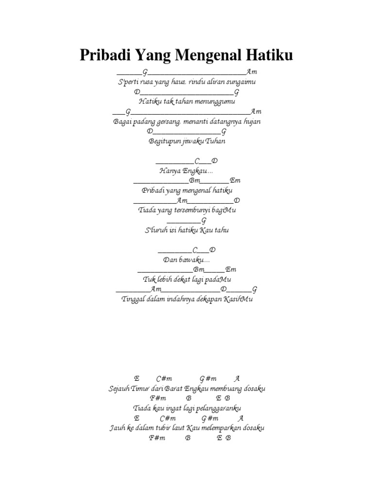 Pribadi Yang Mengenal Hatiku Chord Pribadi Yang Mengenal Hatiku. Dm G G7 C G G7 C Sperti rusa yang haus F Rindu aliran sungai-Mu Dm G C G G7 Hatiku tak tahan menunggu-Mu C Bagai padang gersang F Menanti datangnya hujan Dm G C C7 Begitupun jiwaku Tuhan F G Em Am Hanya Engkau pribadi yang mengenal hatiku Dm G Tiada yang tersembunyi bagi-Mu Gm C C7 Sluruh isi hatiku Kau tahu F G Em Am Dan. G AG Hanya Engkau Fm Bm Pribadi Yang Mengenal Hatiku Em A Tiada Yang Tersembunyi.