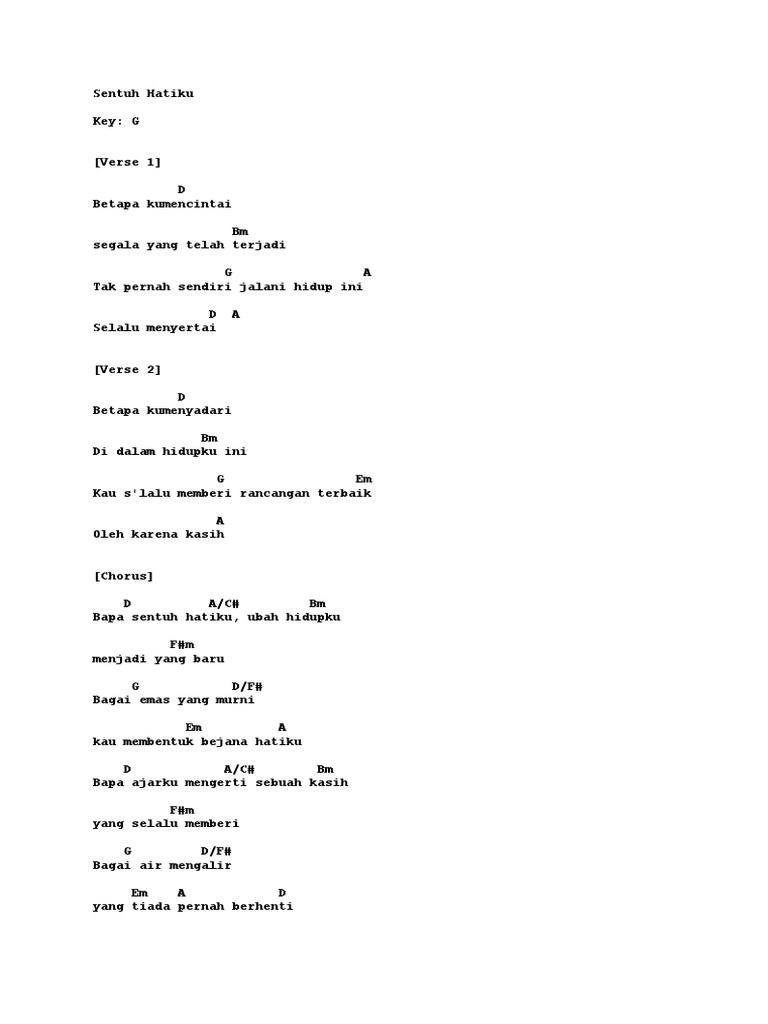 Chord Gitar Lagu - Lagu Rohani Sesuai judulnya blog ini menyediakan chord lagu - lagu rohani kristen. Chord Kunci Gitar dan Lirik Lagu Rohani Kristen - Sentuh Hatiku. Tiada yang tersembunyi bagiMu.