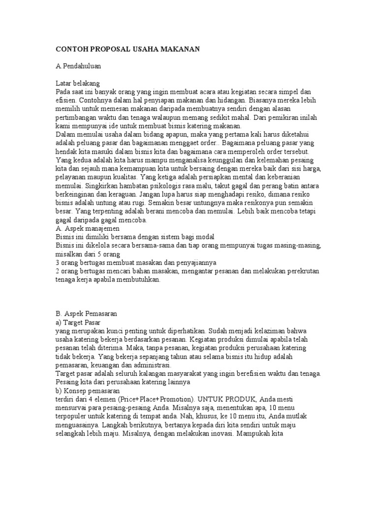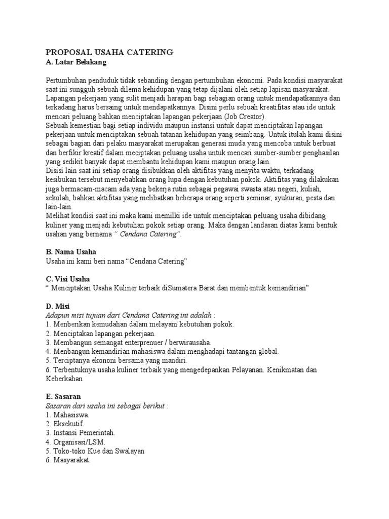 Simpan Simpan CONTOH PROPOSAL USAHA MAKANAN CATERING Untuk Nanti 75 75 menganggap dokumen ini bermanfaat Tandai dokumen ini sebagai bermanfaat 25 25 menganggap dokumen ini tidak bermanfaat Tandai dokumen ini sebagai tidak bermanfaat. Lapangan pekerjaan yang sulit menjadi harapan bagi sebagian orang untuk mendapatkannya dan terkadang harus bersaing untuk.