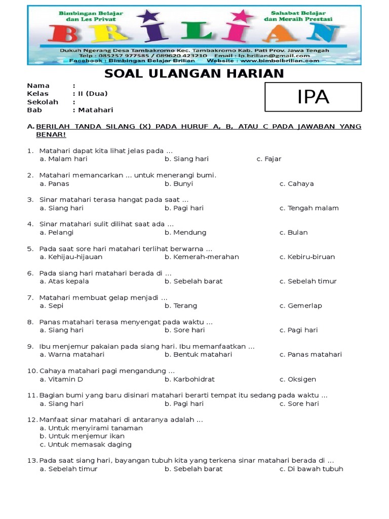 Soal Ulangan Ipa Kelas 2 Sd Semester 2 Bab Matahari