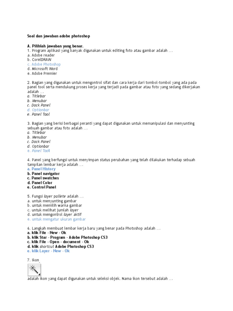 Kumpulan soal tik tentang photoshop. 45 Contoh Soal UAS TIK Kelas 12 SMAMA dan Kunci Jawabnya Terbaru - Bagi sahabat bospedia dimana saja berada yang ingin sekali mempelajari Soal UAS TIK Kelas 12 SMAMA ini adik adik bisa menguduh materi ini di bospedia dalam bentuk file doc. Pilihlah jawaban yang paling benar 1. 1Langkah-langkah yang benar untuk menjalankan program aplikasi Adobe Photoshop 70 adalah.