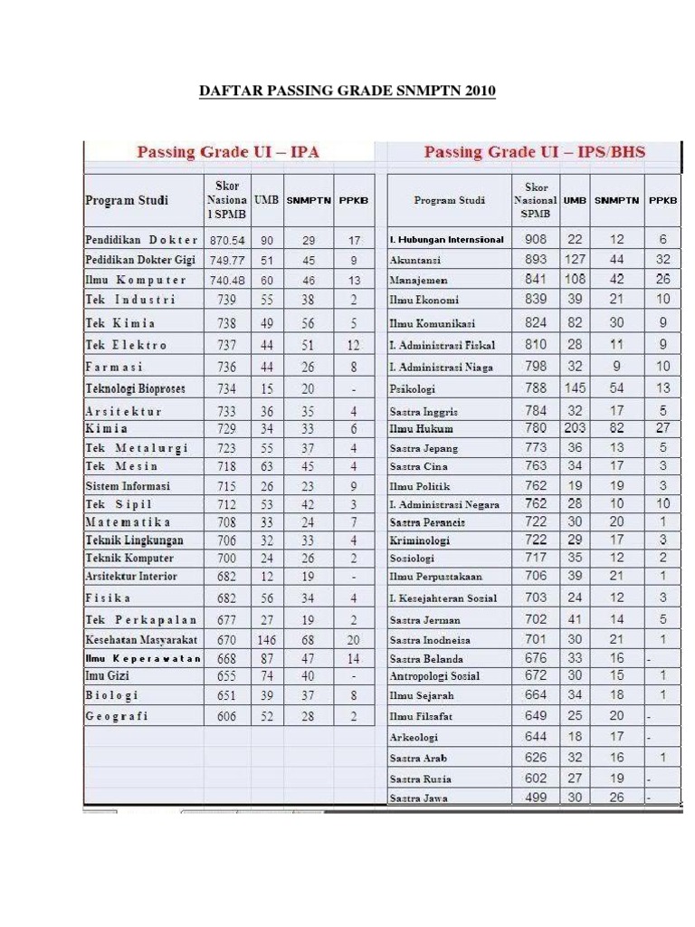 Secara umum nilai passing grade tidak dapat ditentukan secara pasti karena bergantung pada kuota daya tampung dan banyaknya peminat pada pilihan tersebut pada tahun itu.