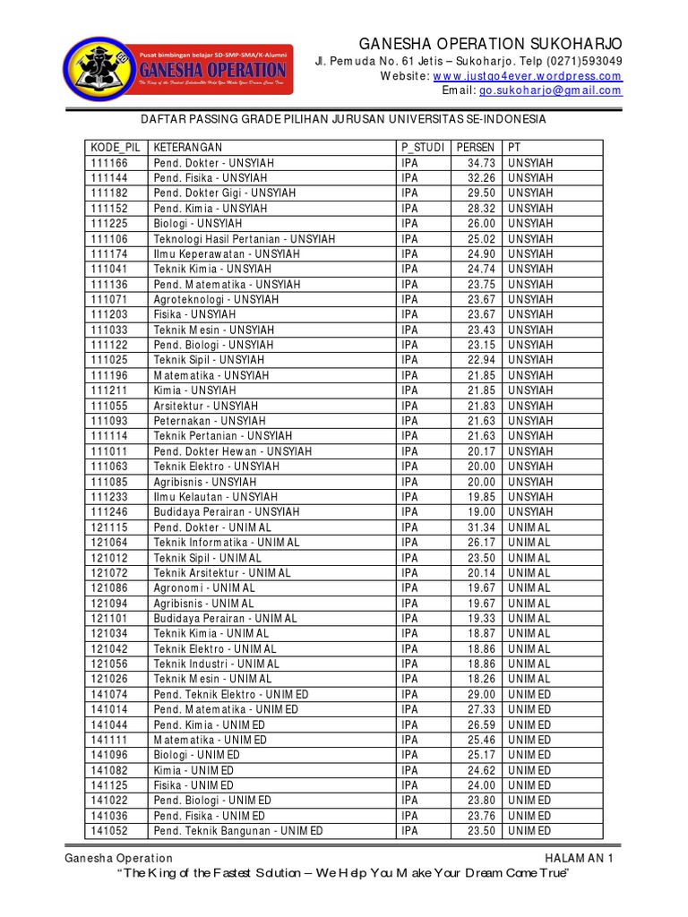 Passing grade unhas 2016 dan daya tampung. Karena jika anda memilih jurusan yang memilki Passing Grade yang tinggi peluang anda untuk lulus SNMPTN UNSOED 2016 akan sangat sulit kecuali jika anda seorang siswa yang ber prestasi yang sangat baik anda akan mampu bersaing untuk bisa lulus SNMPTN UNSOED 2016 ada beberapa jurusan favorit yang memiliki Passing Grade yang tinggi di Universitas Jendral Soedirman UNSOED dari kategori IPA adalah jurusan Pendidikan Dokter dengan Passing Grade. Untuk lebih lengkapnya lagi simaklah penjelasan kami mengenai Passing Grade UNDIP 20192020 dan Daya Tampung Peminatnya di bawah ini. Oleh karena itu maka nilai passing grade tersebut nilainya tiap tahun dapat berfluktuatif.