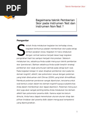 Pengertian dan Teknik-Teknik Pemberian Skor. Pada hakikatnya pemberian skor scoring adalah proses pengubahan jawaban instrumen menjadi angka-angka yang merupakan nilai kuantitatif dari suatu jawaban terhadap item dalam instrumen. Skor BN x 100 skala 0-100 12 Ket.