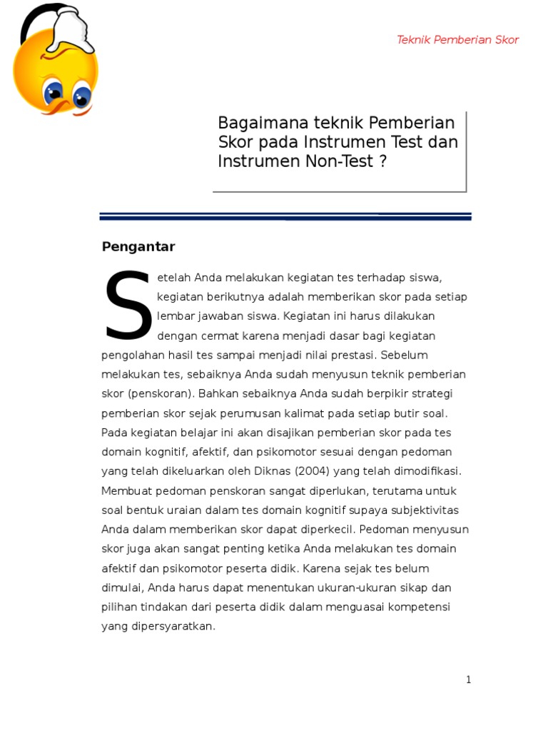 23 TEKNIK PEMERIKSAAN PEMBERIAN SKOR DAN PENGOLAHAN TES HASIL BELAJAR. Teknik Pemberian Skor Hasil Tes Hasil Belajar. Pada hakikatnya pemberian skor scoring adalah proses pengubahan jawaban instrumen menjadi angka-angka yang merupakan nilai kuantitatif dari suatu jawaban terhadap item dalam instrumen.