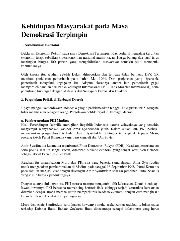 Menyebabkan meningkatnya angka kemiskinan dan pengangguran. 259-261 mengenai kehidupan masyarakat Indonesia pada masa demokrasi terpimpin dari aspek sosial pendidikan dan kebudayaan. Dinamika politik yang terjadi pada masa Demokrasi Terpimpin berupa persaingan antarkekuatan politik yang ada berpengaruh terhadap kehidupan sosial masyarakat Indonesia waktu itu.