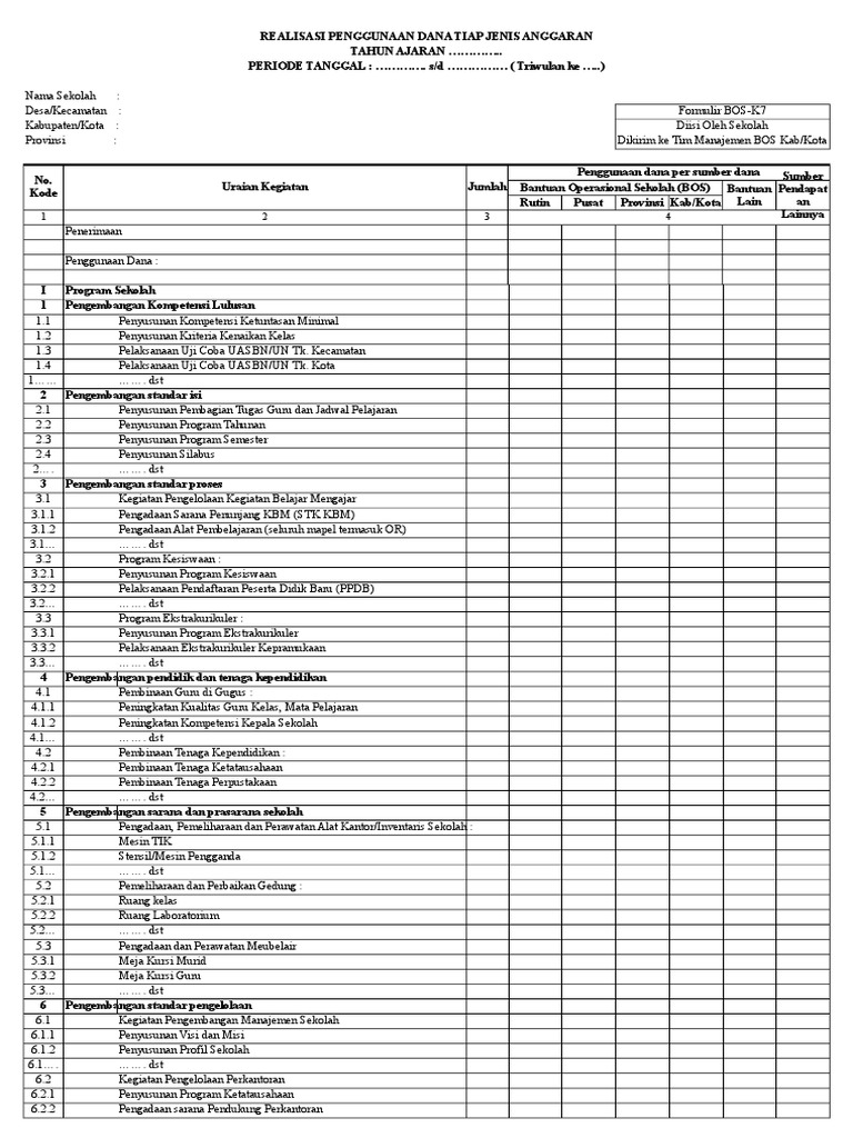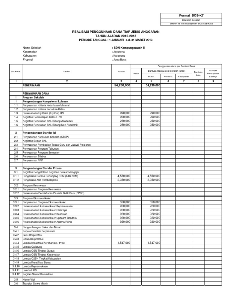 Format bos k7 2017. Berdasarkan fungsinya Format BOS K1K2K3K4K5K6K7K7aK7bK7c pada Laporan BOS ini menjadi salah satu lampiran yang harus ada dan merupakan bagian dari laporan BOS SD SMP SMA SMK MI MTS. Lampiran K7 di dalam laporan BOS ini meliputi Uraian Kegiatan Penggunaan Dana Per Sumber Dana Dana Bantuan Operasional tingkat Kota - Kabupaten - Provinsi Bantuan Lain dan Sumber bantuan lainnya. Namun demikian terdepat unsur yang berbeda didalamnya yang mana pada format K7 BOS tahun 2016 lalu terdapat kolom Pembelian Bahan Habis Pakai pada komponen penggunaan dana BOS namun pada format terbaru yang sekarang kolom tersebut tidak ada atau dihilangkan.
