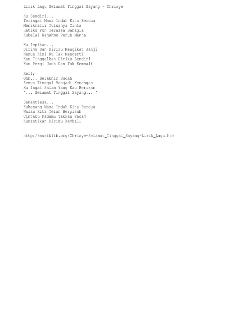 Semua lirik lagu disini disediakan untuk tujuan memudahkan pencarian lirik lagu sekaligus mempromosikan lagu tersebut serta mengapresiasi khazanah musik dan sastra di Indonesia. Jangan lupa SUBSCRIBE dan LIKE-Untuk menonton MV rasmi Selamat Tinggal Sayangk. Namun kini ku tak mengerti Kau tinggalkan diriku sendiri Kau pergi jauh dan tak kembali Oh berakhir sudah Semua tinggal menjadi kenangan Ku ingat salam yang kau berikan Selamat tinggal sayang Senantiasa Ku kenang masa indah.